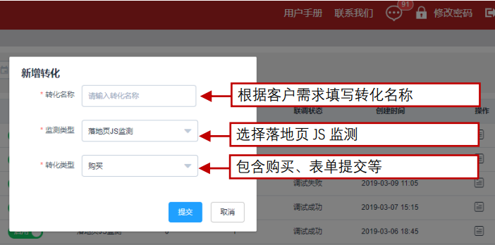 發(fā)表時(shí)間:2026-02-13 11:00 鳳羽廣告平臺(tái)OCPC-落地頁(yè)JS對(duì)接文檔1、什么是鳳羽推廣平臺(tái)? 鳳羽廣告平臺(tái) OCPC-落地頁(yè) JS 對(duì)接方法如下: 第二步:創(chuàng)建目標(biāo)轉(zhuǎn)化。 第三步:代碼添加。 第四步:改造轉(zhuǎn)化代碼-并復(fù)制到落地頁(yè)設(shè)置——底部JS中: